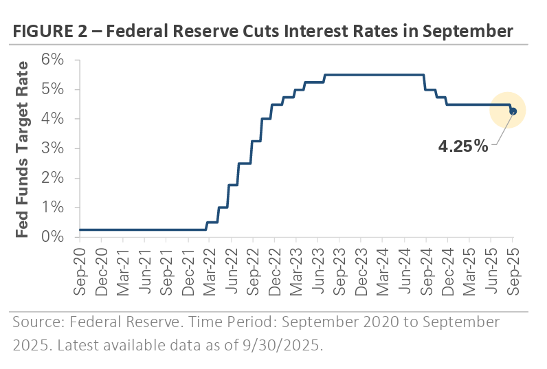 As expected, the Fed delivered a -0.25% rate cut in September, ending its 9-month pause (Figure 2). In his press conference, Fed Chair Powell framed the move as a “risk management” cut, describing it as a proactive step to keep the economic expansion on track rather than concern about a recession. The central bank updated its policy forecast to include two more rate cuts before year-end, with the potential for more in 2026. The revised forecast and Powell’s remarks signaled a measured and gradual rate-cutting cycle rather than an aggressive one.