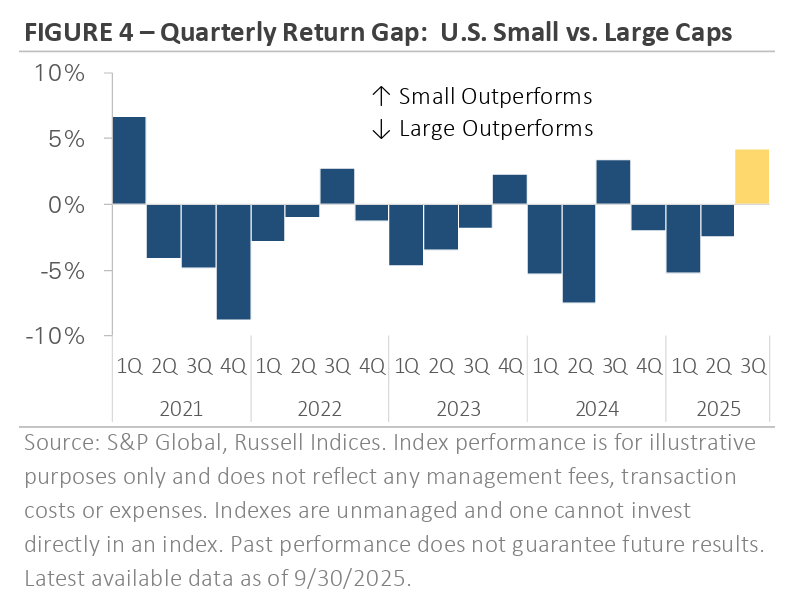 International stocks performed in line with the S&P 500 in Q3, but headline results masked significant divergence beneath the surface. Emerging markets outperformed U.S. stocks, driven by renewed stimulus efforts in China and strong gains from AI-related companies in Asia. The Fed’s decision to resume its rate-cutting cycle provided another tailwind, as emerging markets—like U.S. small caps—are often viewed as more sensitive to rate cuts and shifts in global financial conditions. In contrast, developed markets underperformed U.S. stocks. European equities ended the quarter modestly higher as they consolidated gains from earlier this year. Despite the quarter’s mixed returns, both emerging and developed markets have gained more than +25% year-to-date. The two indices are each outperforming the S&P 500 by more than +10% since the start of 2025.