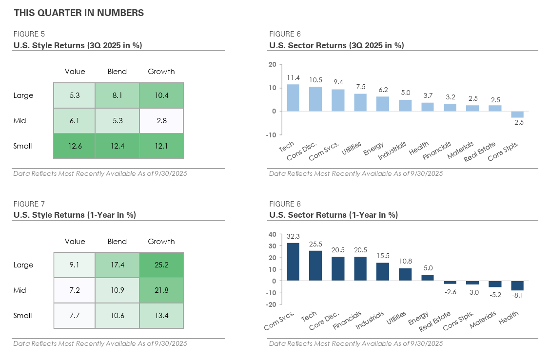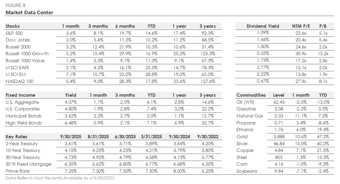 Markets carried their strong momentum from Q2 into Q3, with the S&P 500, Nasdaq, and small-cap stocks each hitting new highs. Investor sentiment remained optimistic despite soft labor market data and mixed economic signals, and stocks traded higher due to strong corporate earnings, the Federal Reserve’s pivot toward rate cuts, and easing trade tensions. The technology sector remained an important contributor, as artificial intelligence (AI) companies reported strong earnings growth. At the same time, improving market breadth added fuel to the rally, and small-cap stocks finally broke above their 2021 highs. In this letter, we recap Q3’s defining themes, review stock and bond market performance, and look ahead to the final quarter of 2025.
