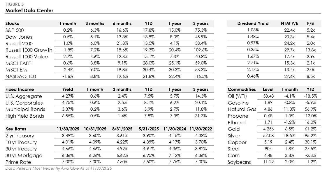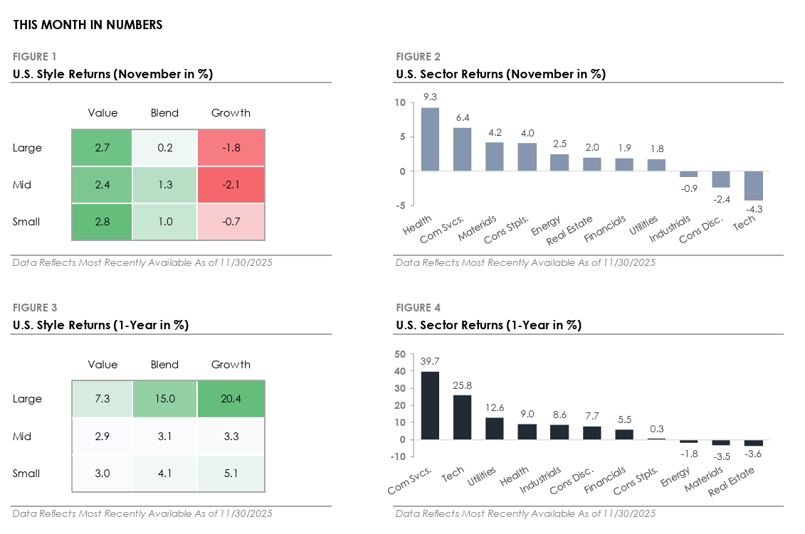 - The S&P 500 Index returned +0.2% in November, its seventh consecutive monthly gain. Large Cap Growth declined -1.8% as AI-related names came under pressure, while Large Cap Value rose +2.7%. The Russell 2000 and the Dow Jones Index both outperformed the S&P 500 as mega-cap tech stocks weighed down the index.
