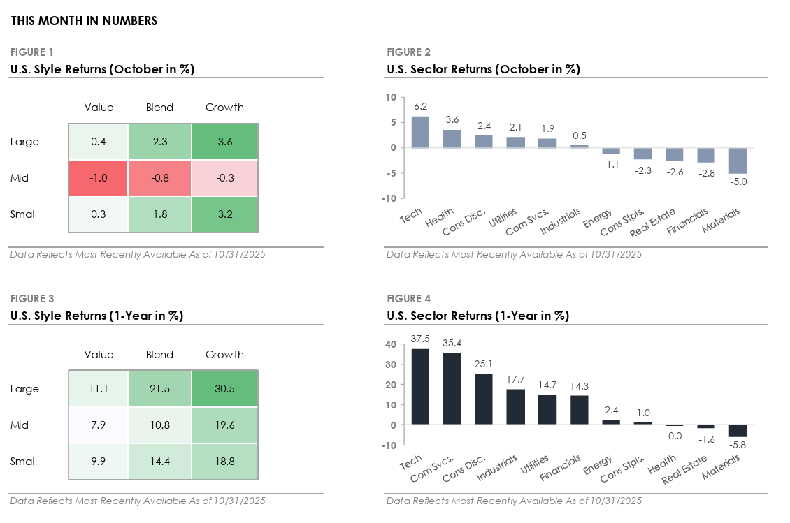 Stocks ended October near all-time highs after they staged a late-month recovery. Credit concerns surfaced early in the month after multiple regional banks disclosed losses tied to commercial real estate fraud. The news came only weeks after two high-profile bankruptcies in the auto sector and reignited concerns about credit quality. Stocks initially sold off, but by month-end, concerns eased as credit rating agencies and analysts characterized the issues as isolated rather than systemic.