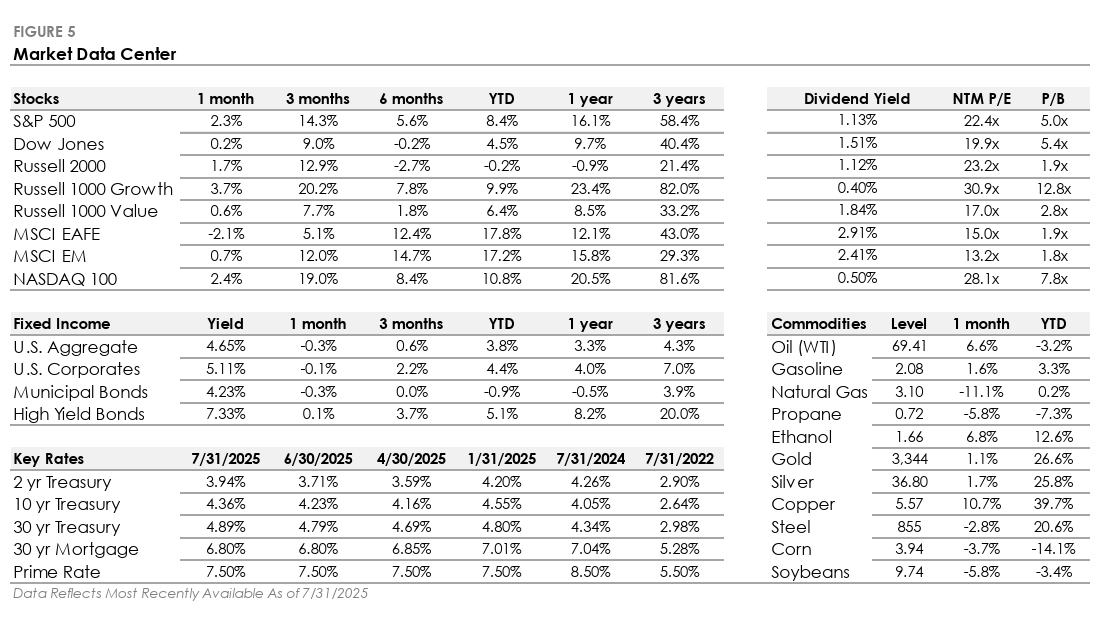 - The S&P 500 Index rose +2.3% in July, pushing its year-to-date return to +8.4%. Large Cap Growth stocks led with a +3.7% gain, while Large Cap Value gained +0.6%.